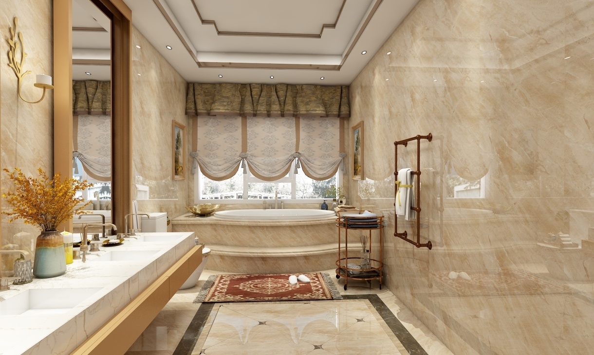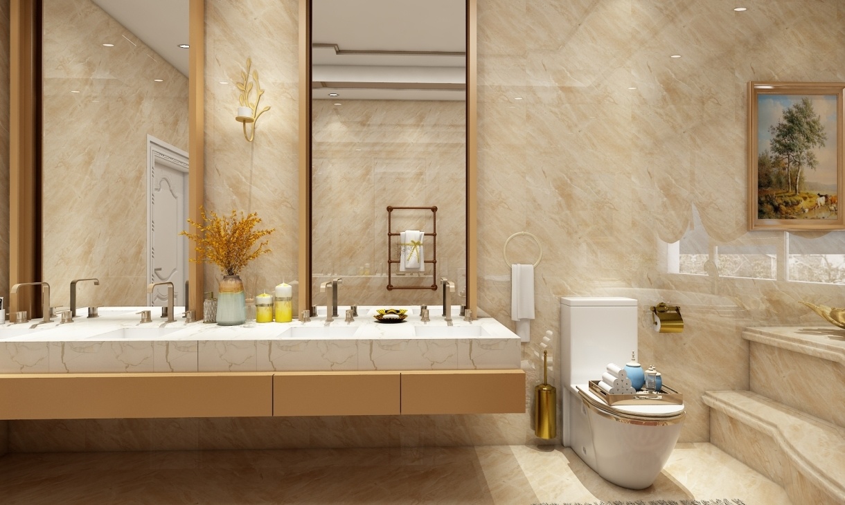 衛生間里的洗手盆配上歐式的鏡子,高貴大方。瓷磚的鋪貼,提升了室內的時尚度和美觀度。