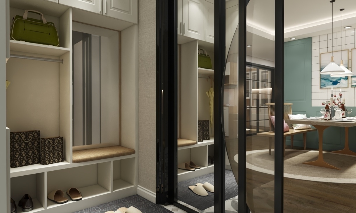 采用幾何線條的收納柜,地板的花紋豐富類別,帶來類空間變化的連續性和形體變化的層次感,細節裝飾的多變性,強化主題風格的同時,提升了空間的藝術感,透過玻璃門就可以看到里面精致的空間,引人入勝。