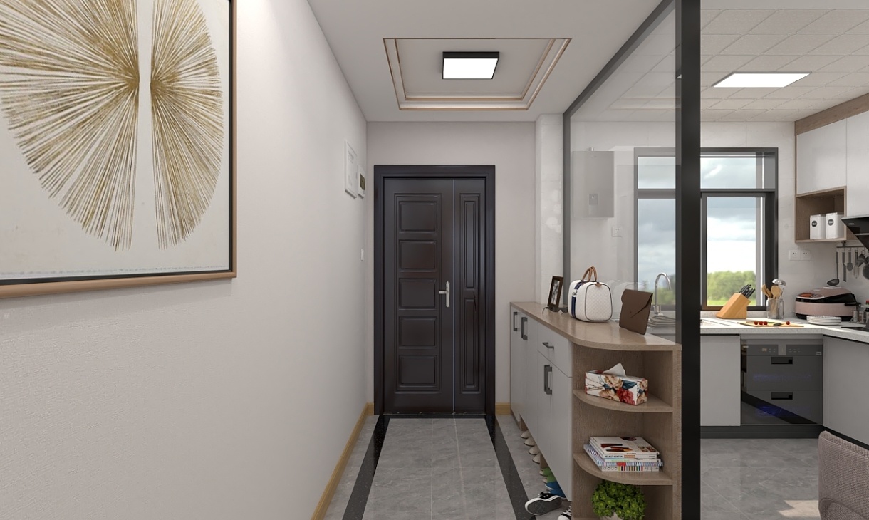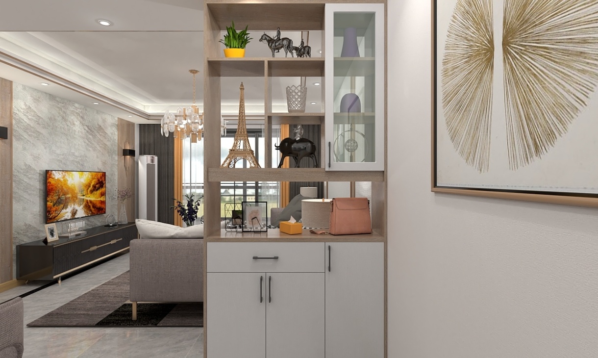 這個設計不僅簡約大氣,還非常有質感,采用幾何線條的收納柜,木色與白色完美結合,采用大量的素色系材料將空間開放寬闊起來,背景墻也是采用淺色設計,簡單利落。