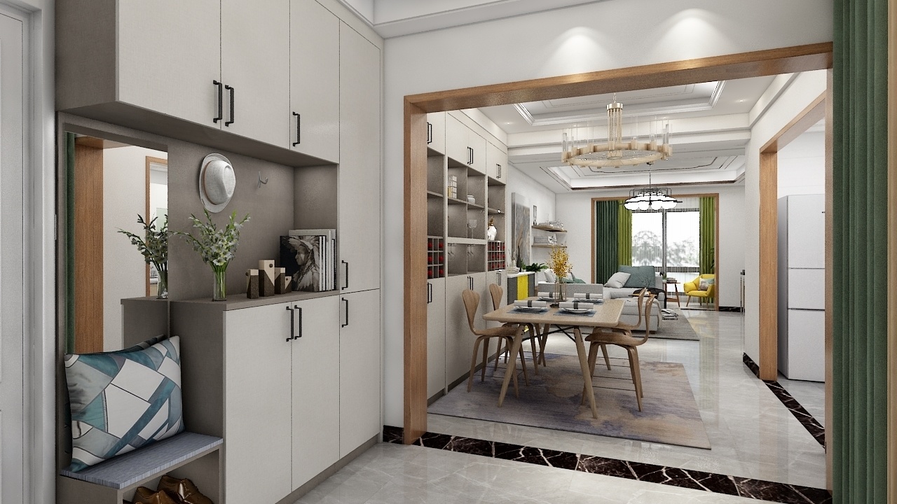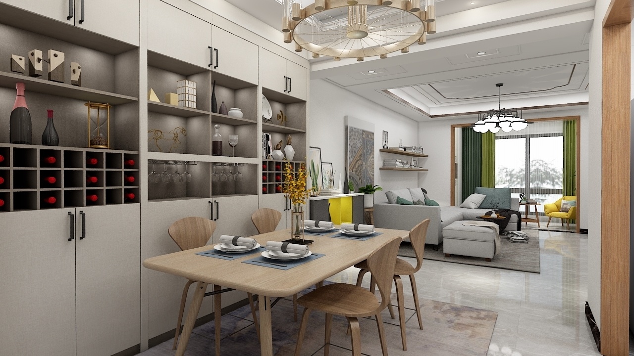 此方案整體空間為淺色系,線條簡潔硬朗,格調白作為主顏色,結合實用主義功能,來表達了現代隨意致簡美學。