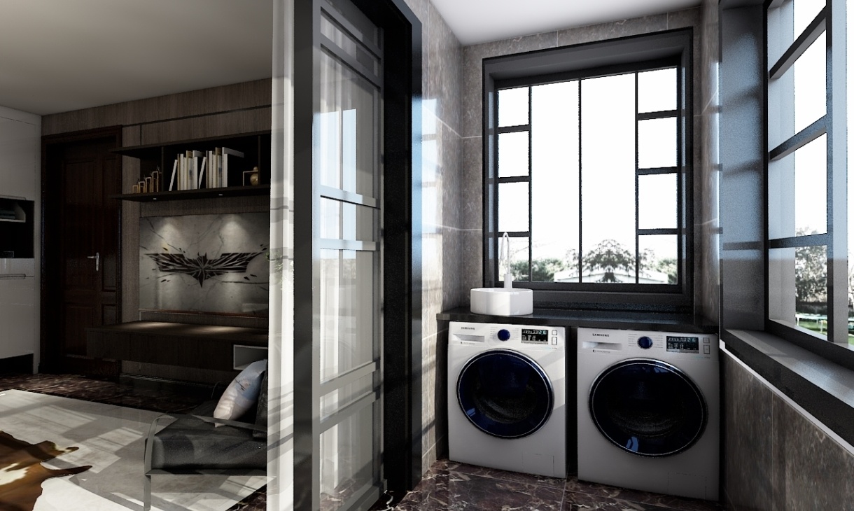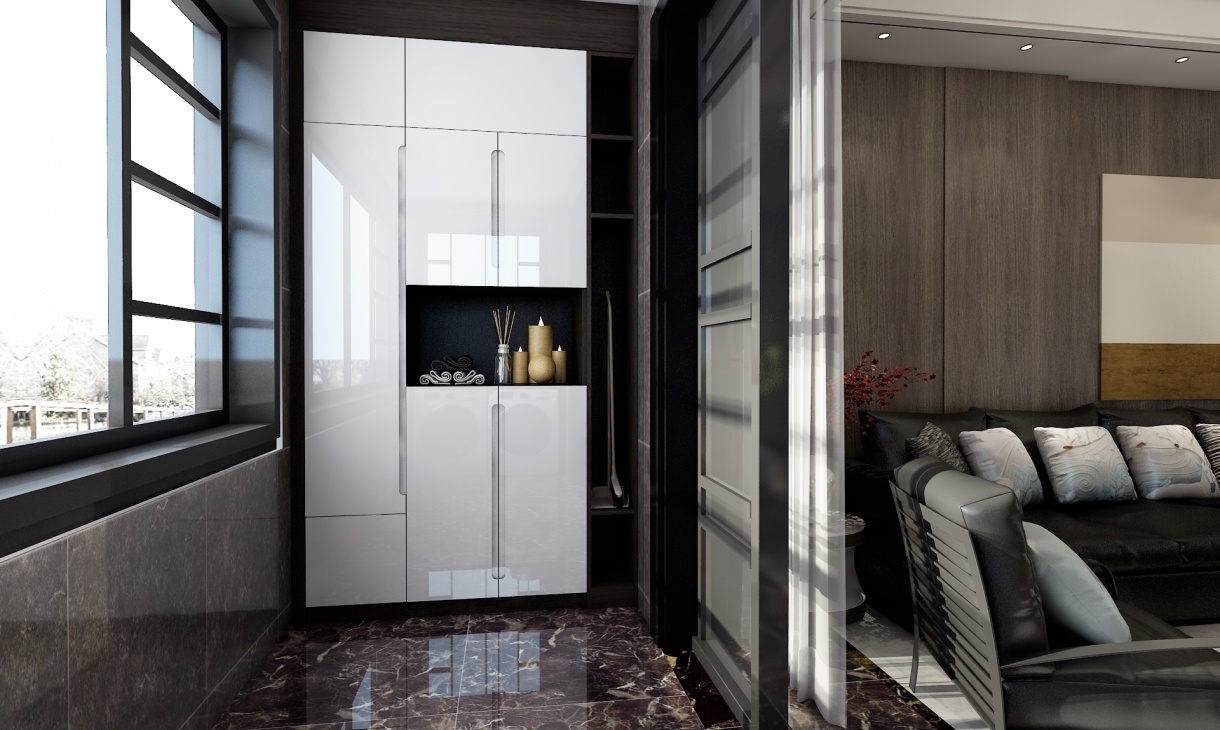 本案整體色調以黑白灰為主,強調自然光對室內空間材質肌理的表現(xiàn),在定制產品上運用了黑木紋配烤漆的經(jīng)典色來彰顯空間格調。