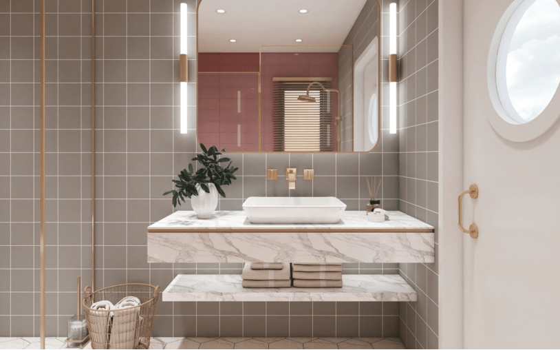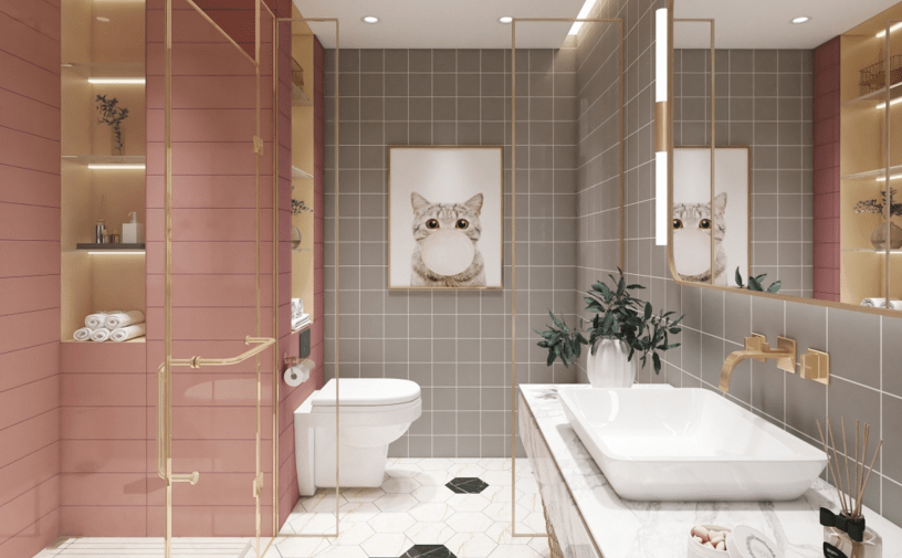 質感高雅紅和貓咪是最受女孩歡迎的事物,本設計采用較低飽和度的紅色與暖調的灰色,溫暖且柔和的色調包裹著空間,搭配素雅的毛巾,暗沉的綠植,優雅迷人,營造出溫暖的空間,讓家的一部分更加溫馨。
