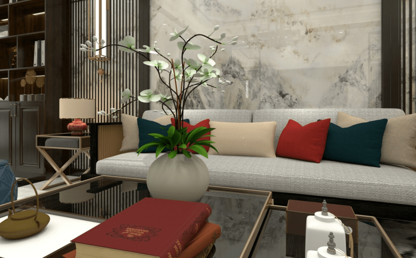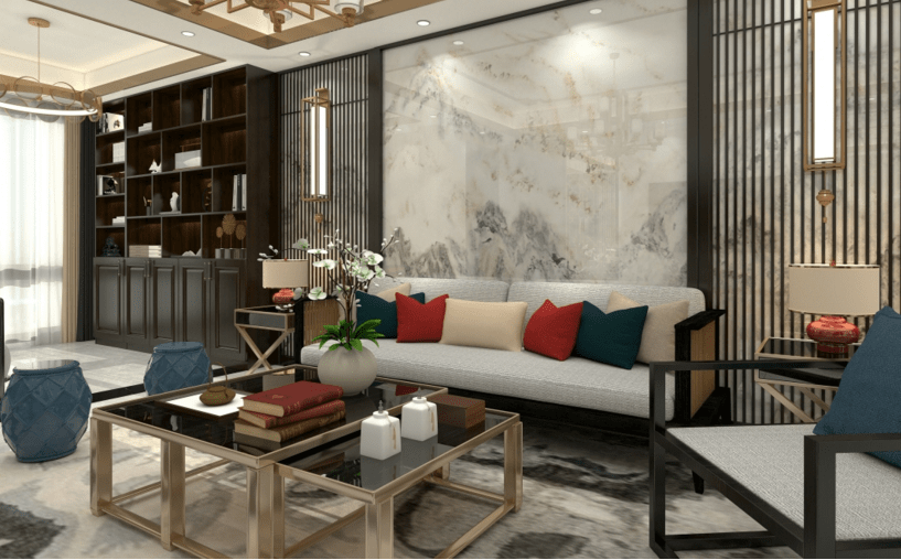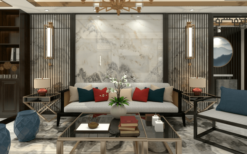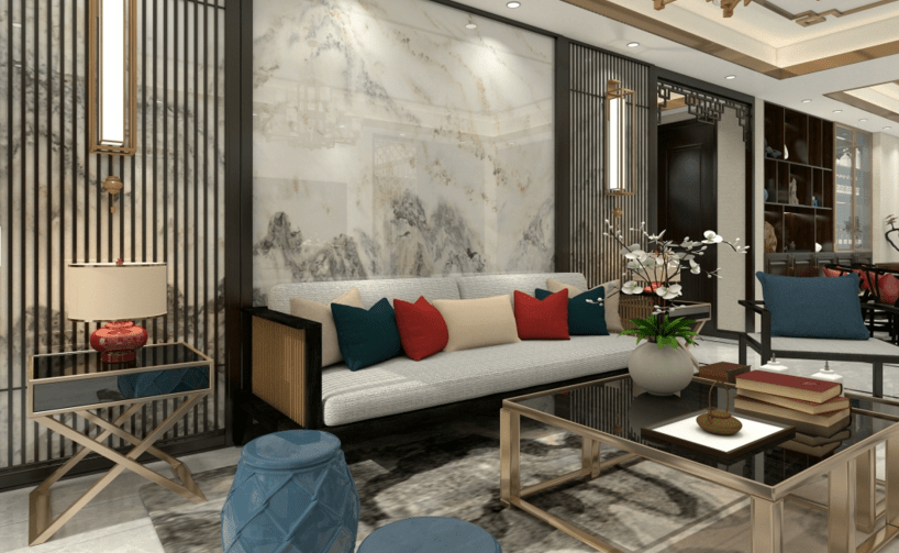 本案應用了新中式的元素設計,搭配經典的紅藍配色。使得元素中有著濃濃的中國風。中國紅的點綴,與鈦金,黑胡桃木柜體的搭配,讓家中感到一些溫暖。客廳的吊頂與地面中國結的造型呼應,玄關走廊盡頭的設計,實現一步一景。