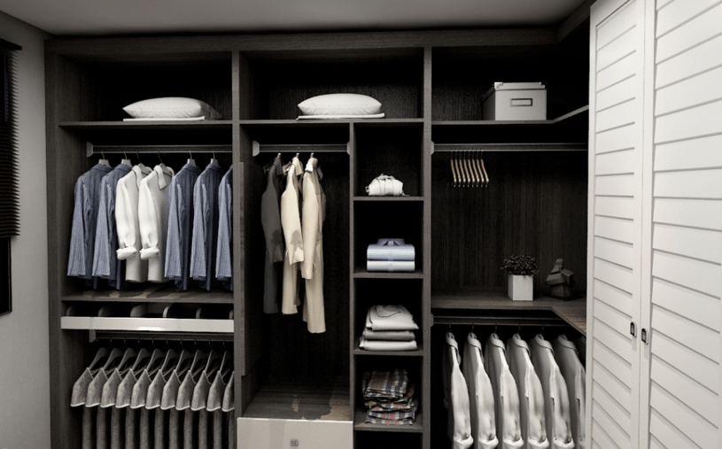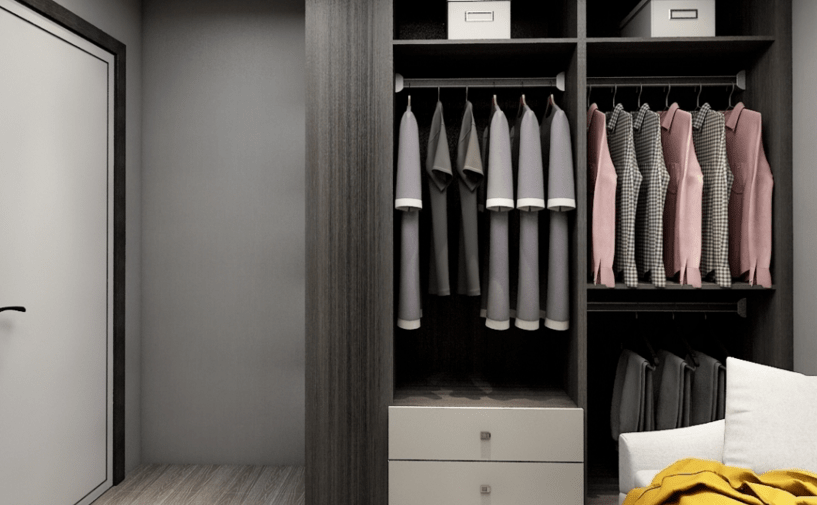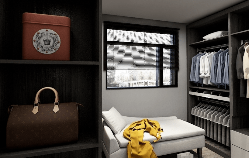 衣帽間以深色柜體搭配灰色系柜門 男女區分開,鞋柜設計為百葉門,便于空氣流通,細致的擺設彰顯品位,現代設計中的表現手法使整體空間更加簡單,充滿格調。