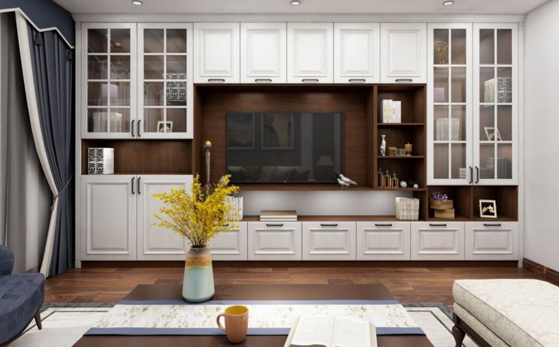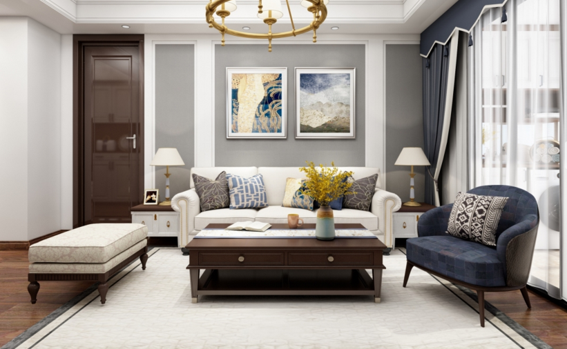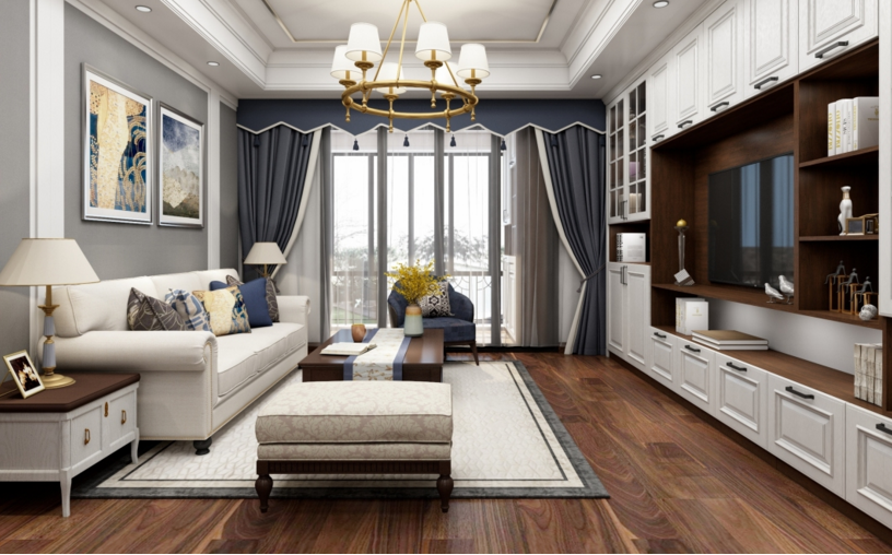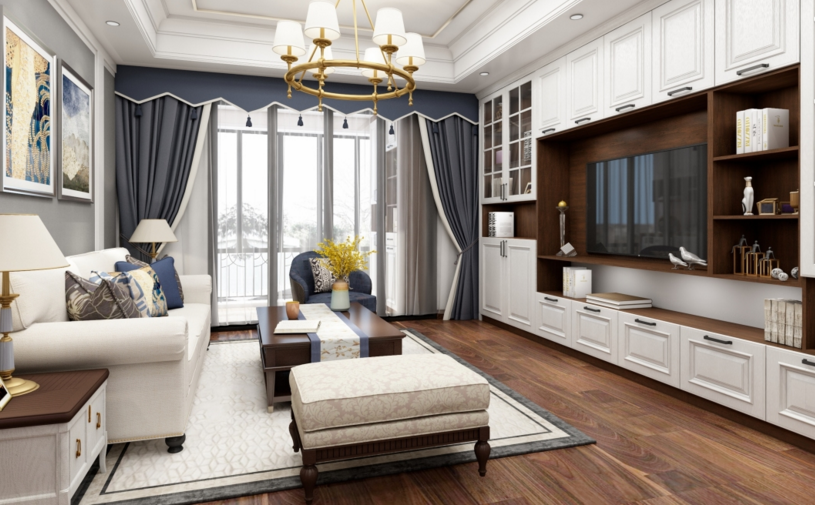 客廳設計具有簡歐風格的大氣典雅,同時帶有些許時尚簡約感,空間以米白色為主調,并點綴各種清透的藍色和黃色兩種對比色,整體清麗高雅,溫馨浪漫。簡化的歐式線條明快利落,幾何圖案的天花簡單而別致,窗簾抱枕和掛畫的藍色相呼應。歐式布藝和金屬吊燈臺燈,彰顯出一種古典歐式的雅致韻味,現代風格的家居又增添了簡約清爽感。一組半開放式的電視柜既滿足收納雜物,又可擺放特色的飾品。