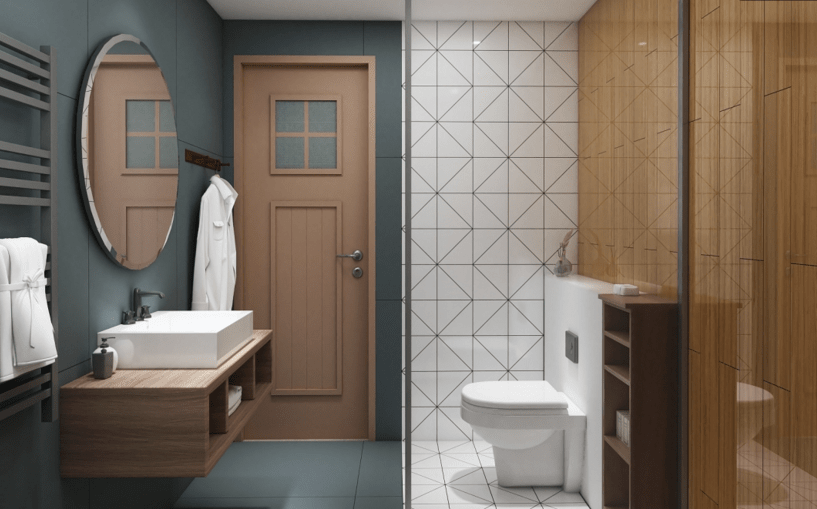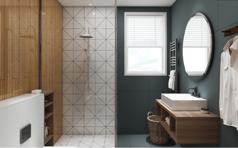 出于實用考慮,完美的實現(xiàn)了干濕分離,墻面采用木紋磚,幾何線條的地磚給人通透的整潔感,干區(qū)則沿用了綠色,木色收納柜也與綠色完美的契合。旁邊放置了收納籃等日常用品,處處體現(xiàn)了的生活氣息。