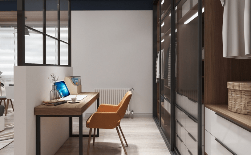 到頂的衣柜絕對足以滿足日常收納,書桌與衣柜一體的設計,節省空間的同時讓主臥兼顧了閱讀、工作的功能。