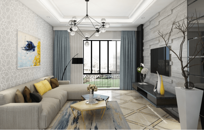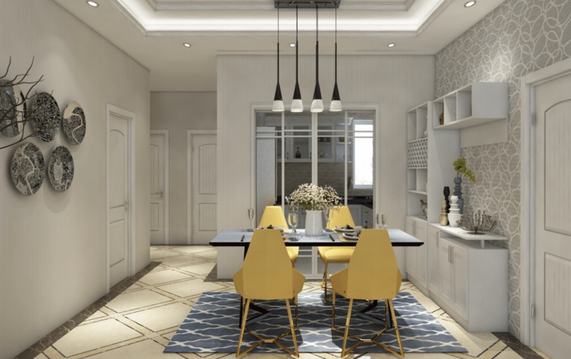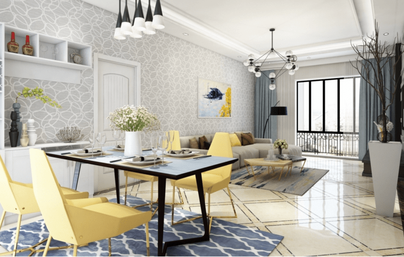 墻面選擇溫和的灰藍色搭配淺灰色,文雅樸素的同時,演繹清新恬淡的風格,使得整個空間溫柔嫻靜,打造寧靜、沉穩的時尚感。沙發選擇低調的麻布色,視覺上淡雅同時不失去大氣。現代風格輕松簡約,體現在餐廳家具的選擇上,采用最簡單的亮黃色椅子,簡潔流暢的線條,明朗輕快。