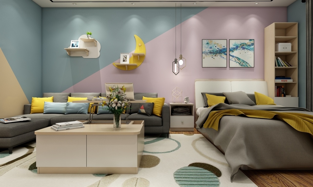 設(shè)計具有簡歐風(fēng)格的大氣典雅,同時帶有些許時尚簡約感,空間以米白色為主調(diào),并點綴各種清透的藍色和黃色兩種對比色,整體清麗高雅,溫馨浪漫。簡化的歐式線條明快利落,窗簾抱枕和掛畫的藍色相呼應(yīng)。歐式布藝和金屬吊燈臺燈,彰顯出一種古典歐式的雅致韻味,又增添了簡約清爽感。一組半開放式的電視柜既滿足收納雜物,又可擺放特色的飾品。