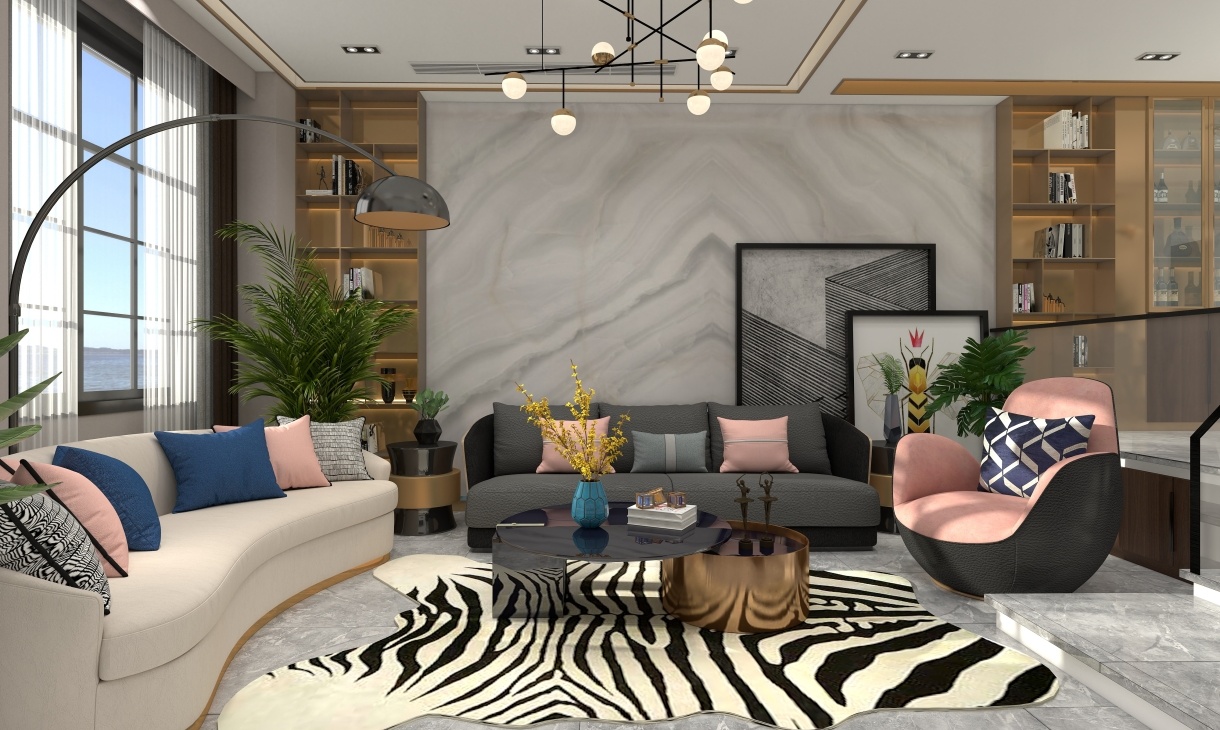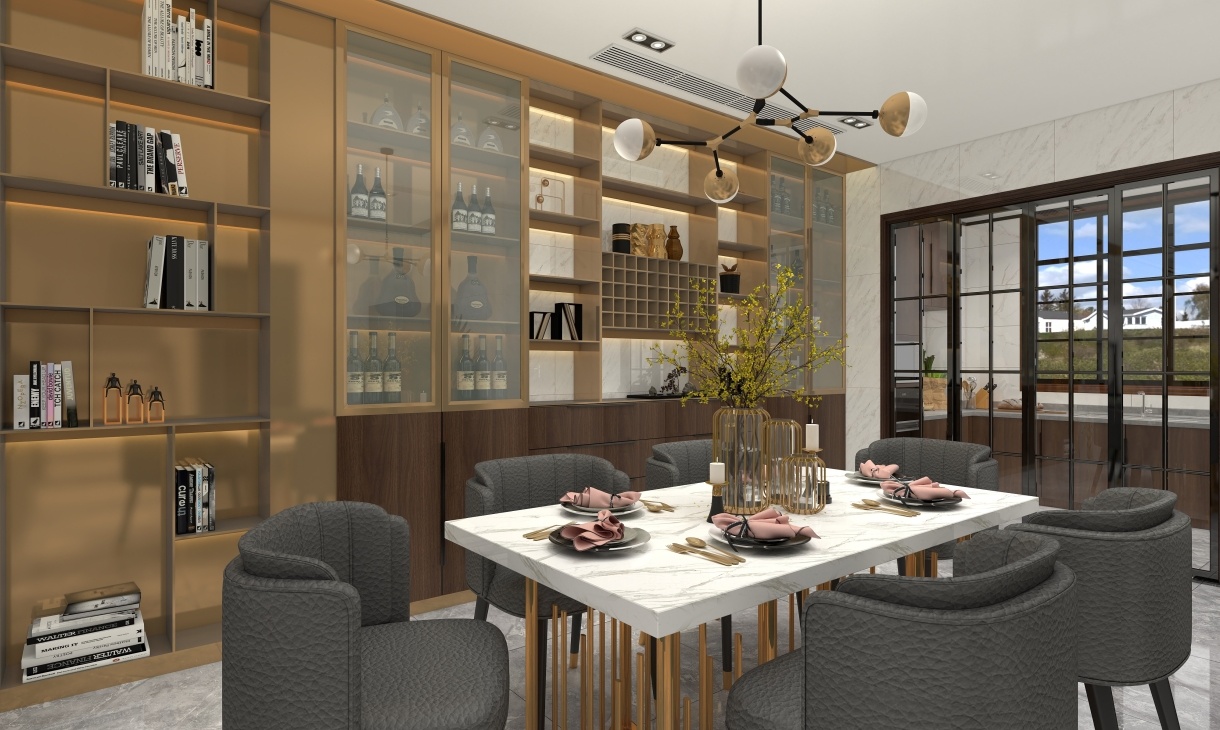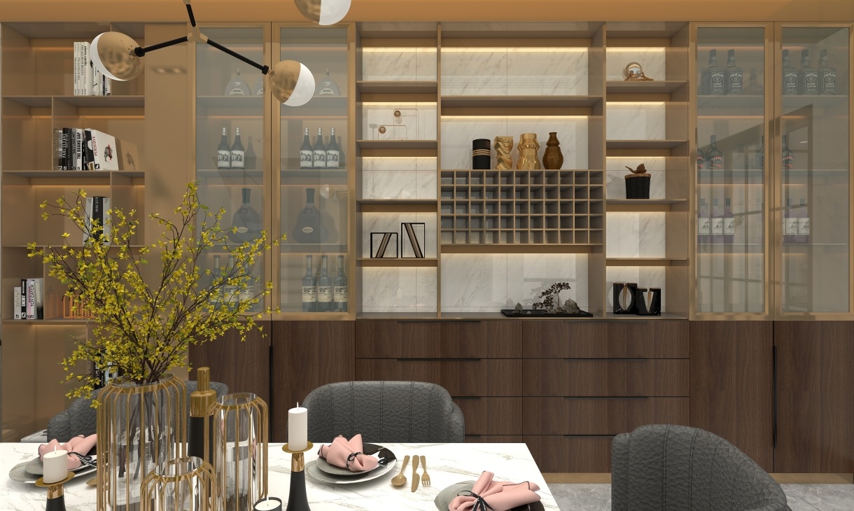 本案風格采用現代輕奢,輕奢風格注重硬裝修手法的簡潔,但也并不像一般的簡約風格那樣隨意,看似簡潔樸素的外表之下,卻常常折射出一種隱藏的貴族氣質,所以又給人時尚前衛、氣質優雅,且不失溫馨舒適的感覺。運用了大量的金屬材質作為柜體。搭配燈光的設計,折射出輕奢的感覺。暖光與白光的結合。使得灰色系也能有一些溫暖的感覺。