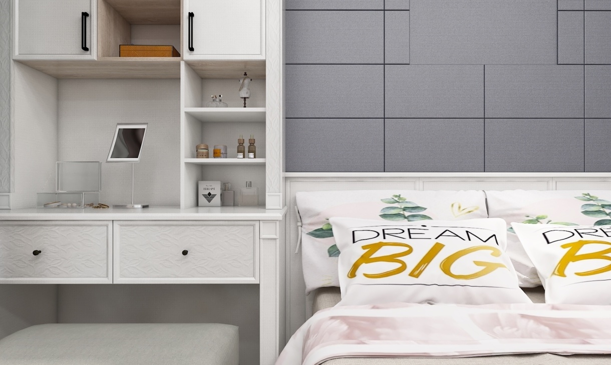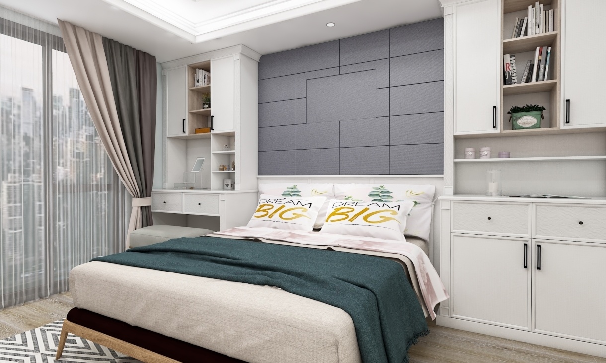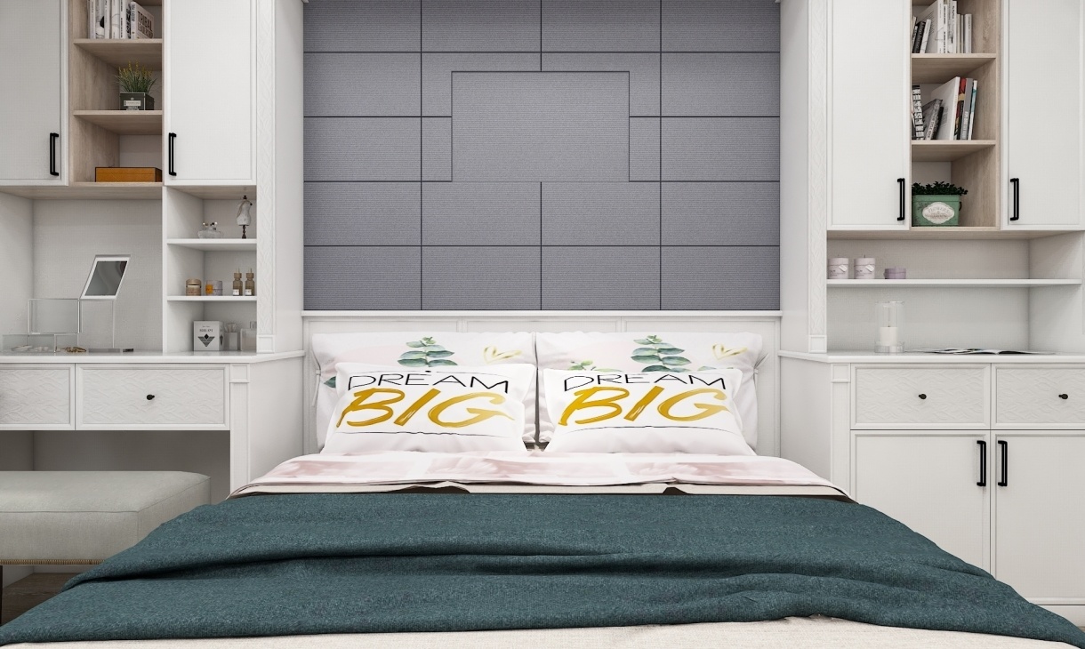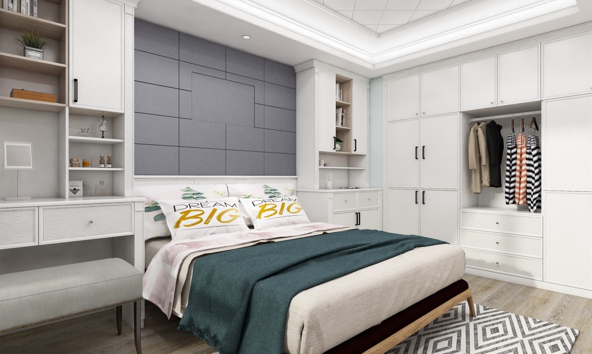 此方案整體空間為淺色系,線條簡(jiǎn)潔硬朗,格調(diào)白作為主顏色,奠定了空間低調(diào)的質(zhì)感、優(yōu)雅的基調(diào),衣柜以及書桌銜接合理,整體氛圍休閑而溫馨,簡(jiǎn)約美觀。