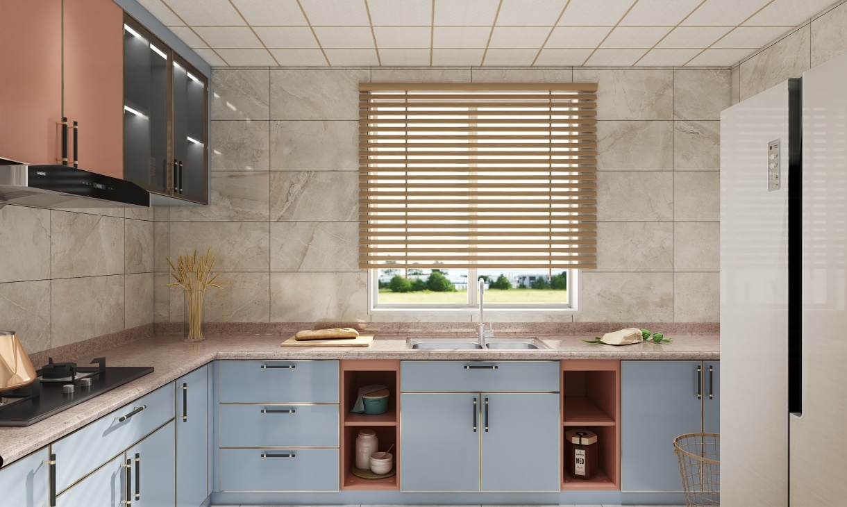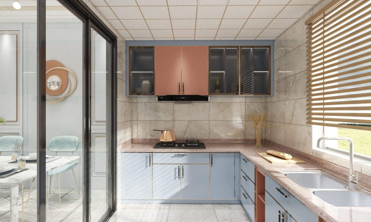 此方案整體空間為淺藍系,線條簡潔硬朗,格調藍作為主顏色,奠定了空間低調的質感、優雅的基調,櫥柜以及廚電銜接合理,整體空間簡約美觀。