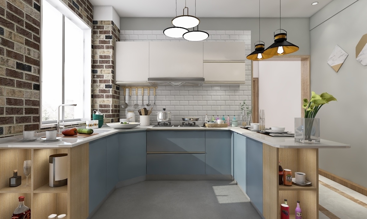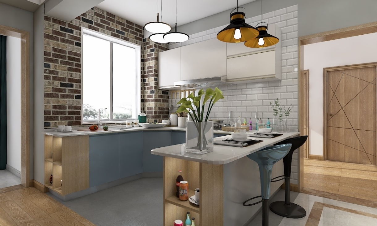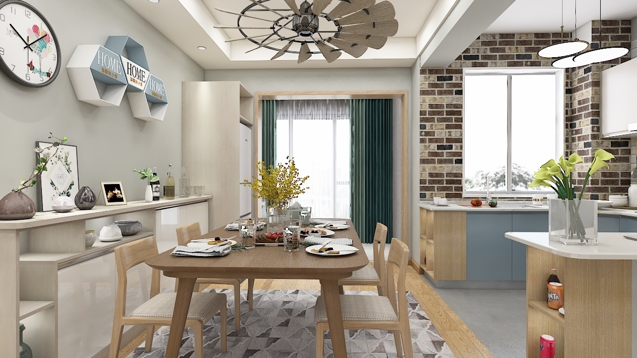 此方案整體空間看似顏色雜亂,實則線條簡潔硬朗,格調藍和原木色作為主顏色,奠定了空間低調的質感、優雅的基調,櫥柜以及整個空間銜接合理,整體豐富美觀。